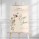 Fall Boho Wildflower Bridal Shower welcome sign with scripted lettering and beautiful, whimsical watercolor wild flowers in burgundy, violet and cream hues. Minimal and elegant bridal shower decorations for fall or autumn bridal showers.