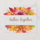 Beautiful watercolor split graphic features autumn flowers and foliage with center customizable "gather together" text in modern light brown font.