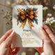 Autumn Theme: The card features warm fall colors, such as rich oranges, deep reds, and soft yellows, accented with delicate pink bows to celebrate the arrival of a baby girl.