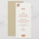 A lovely menu card featuring roses in shades of red, orange, and yellow, with flower buds and sprays set off with foliage in shades of green and taupe, on a softly colored background. Back is a darker shade. Text is framed by a thin border, with a small bouquet at the bottom. Perfect for a fall wedding, or a rustic theme. Coordinating invitations and more also available.