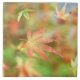 Against the backdrop of green summer leaves of a Japanese maple flushing to autumn reds and yellows, a rose and gold skeleton leaf drifts slowly down to the ground.