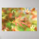 Against the backdrop of green summer leaves of a Japanese maple flushing to autumn reds and yellows, a rose and gold skeleton leaf drifts slowly down to the ground.