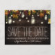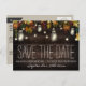 Fall Firefly Mason Jar Wedding Save the Date Cards - features a rustic barn wood background with maple, oak and other leaves in fall colors -- red, burgundy, yellow, green and orange with string glowing lights through out. Mason jars filled with lights or fireflies are also added to the design.