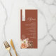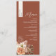 Bring cozy fall elegance to your wedding table with this personalized terracotta wedding menu featuring each guest's name on a vertical cream strip. The rich rust background sets the tone for an autumn celebration, while soft blush, peach, and ivory florals with dried foliage add rustic romance. A clean layout with elegant script and serif fonts makes this menu ideal for boho, earthy, or outdoor weddings. Fully customizable with your meal details and guest list, it's both a stylish place setting and a meaningful keepsake.