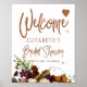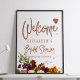 Modern glamorous autumn fall bridal shower welcome sign poster featuring rusty orange and burgundy flowers, green foliage, a heart, and a classy whimsical handwritten brushed style copper glitter calligraphy script over a white background. +++++++++++ Easy to personalize with the name of the bride, date and place! ++++++++++ Suitable for modern floral glam, outdoor garden end of summer or autumn fall backyard elegant wedding bridal parties.