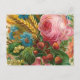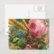 A beautiful vintage floral image showing a rich bounty of fruits and flowers - corn, strawberries, grapes, cornflowers and large pink roses.