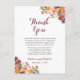 Our fall floral wedding place setting thank you cards with orange, burgundy, cream, and pink flowers are a sweet and sentimental way to decorate your wedding place settings. The wording is completely customizable. Use Zazzle's "Personalize this template" tool to enter your own wording and information. If you need to change the placement of the text boxes, font color or size just click on the "Click to customize further" button to change those things. Be sure to check out our large selection of coordinating items by browsing the Fall Flower Wedding collection!