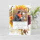 Dramatic and elegant Save the Date card features your couple's photograph surrounded by large fall flowers and autumn foliage. The fall floral arrangement contains golden yellow sunflowers, dark red roses, and white hydrangea flowers. Deep green and olive leaves deepen the autumn vibe. Modern Boho Botanical is very popular this season. The soft dove grey text provides the wedding details. This Save the Date Card is part of the Sunflower and Burgundy collection. It has the templates you need to create a Save the Date stationery suite your guests won't forget!