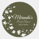 Pretty and modern bridal shower sticker features a spray of white flowers and white customizable text on Fall green background