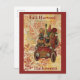 Pumpkin man and cat driving automobile with vegetable people and Fall colored leaves and berries in background
