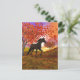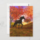 Postcard with my computer artwork of a galloping brown horse in a windy autumn day with blowing fall maple leaves.