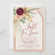 Celebrate the bride to be with this Fall in Love bridal shower invitation, featuring an elegant fall watercolor floral bouquet of burgundy red chrysanthemum blooms, blush pink roses, eucalyptus greenery, pheasant feathers, dried pampas grass foliage, golden autumn leaves and more. The design is framed by a graceful yet modern arch in warm terracotta rust orange and soft oatmeal beige for a natural, earthy feel. With its modern rustic boho style, this invitation sets the perfect tone for an autumn celebration. Pair with coordinating signs, thank you cards, games, favors, and décor from the Fall in Love event suite for a beautifully cohesive bridal shower this fall.