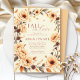Fall in love peach floral border bridal shower invitation. This elegant bridal shower invitation features an oval floral border in a soft watercolor style, giving the entire design an artistic feel. The border is composed of branches adorned with peony-like flowers, pinecones, dried botanicals, and leaves, rendered in warm peach, brown, golden and muted green tones that evoke the cozy charm of autumn. The phrase “FALL in love” is displayed in a graceful combination of script and elegant typography, adding a romantic and whimsical touch. The overall aesthetic blends rustic sophistication with the gentle fluidity of watercolor illustration, making it perfect for a seasonal celebration with a refined, nature-inspired theme.