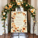 Fall in love peach floral border wedding welcome foam board sign. Gracefully welcome your guests to your celebration with this exquisite "Fall in Love" Wedding Welcome Foam Board Sign. This elegant design features a soft watercolor oval floral border, giving the entire piece an artistic and romantic feel. The border is beautifully composed of delicate branches adorned with peony-inspired blooms, rustic pinecones, dried botanicals, and verdant leaves, rendered in a warm palette of peach, rich brown, golden hues, and muted greens that perfectly evoke the cozy charm of autumn. The central phrase "FALL in love" is charmingly displayed in a graceful blend of flowing script and refined typography, adding a whimsical touch. This sign seamlessly combines rustic sophistication with the gentle fluidity of watercolor artistry, making it an ideal welcome for a refined, nature-inspired seasonal celebration.