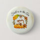 A button with a typography design which says Fall is in the air. Illustrated with an adorable squirrel standing behind some orange watercolor pumpkins. A decorated foliage wreath surrounds them with an oak leaf, an acorn, autumn orange flowers and other sprigs and leaves. Background is a vintage looking off-white with aged light brown edges.