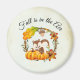 A magnet with a typography design which says Fall is in the air. Illustrated with an adorable squirrel standing behind some orange watercolor pumpkins. A decorated foliage wreath surrounds them with an oak leaf, an acorn, autumn orange flowers and other sprigs and leaves. Background is a vintage looking off-white with aged light brown edges.