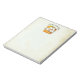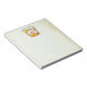 A notepad with a typography design which says Fall is in the air. Illustrated with an adorable squirrel standing behind some orange watercolor pumpkins. A decorated foliage wreath surrounds them with an oak leaf, an acorn, autumn orange flowers and other sprigs and leaves. Background color is a vintage looking off-white with aged light brown edges.