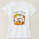A t-shirt with a typography design which says Fall is in the air. Illustrated with an adorable squirrel standing behind some orange watercolor pumpkins. A decorated foliage wreath surrounds them with an oak leaf, an acorn, autumn orange flowers and other sprigs and leaves.