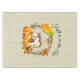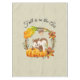 Tablecloth with a typography design which says Fall is in the air. Illustrated with an adorable squirrel standing behind some orange watercolor pumpkins. A decorated foliage wreath surrounds them with an oak leaf, an acorn, autumn orange flowers and other sprigs and leaves. background is a cream color with black speckles.