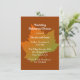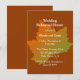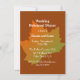 Autumn themed wedding rehearsal dinner invitation, with graphics of a a colorful fall maple leaf, in the middle, against a pumpkin spice colored background. Personalize the white text to suit your event needs. Invitation is shown on the regular style basic card stock, chose the shape and card stock you prefer.