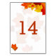 Fall leaves table number cards with number and decorations on both sides. Vertical card is white with orange and yellow leaves. Rust orange number will appear on both sides when changed. Add each card to your cart, and then click on it - in the cart - and add the next number.
