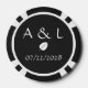 Give the guests, bridesmaids, groomsmen, or anyone else attending or helping with your autumn-themed wedding or special event a special treat with these customizable poker chips. One side of the poker chip features a white leaf silhouette on a deep black background. The other side has a sample set of initials and date separated by a matching leaf. The sample text can be customized with your own details or a special message of your choice to create a unique and personal token to commemorate your big day. This design will match any product from the Fall Leaves in Black line so that you can make your fall wedding or special event as coordinated as you like.