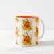 Ceramic coffee mug shown with a pretty autumn fall leaves print.Mug is shown in white with a orange interior color.