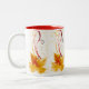 Ceramic coffee mug shown with a pretty autumn fall leaves print.Mug is shown in white with a red interior color.