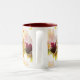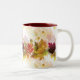 Ceramic coffee mug shown with a pretty autumn fall leaves print.Mug is shown in white with a maroon interior color.