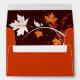 Fall leaves orange red white brown wedding envelope, featuring beautiful autumn red, orange and white maple leaves in fall colors and graceful swirls on brown background on the inside and red-orange on the outside. An elegant, modern invitation perfect for a fall wedding traditional or contemporary.