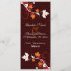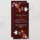 Fall leaves orange red white brown wedding menu card, featuring beautiful autumn red, orange and white maple leaves in fall colors and graceful swirls on brown background. An elegant, modern invitation perfect for a fall wedding traditional or contemporary.