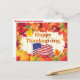 A gorgeous Thanksgiving Greetings postcard, with colourful fall leaves, pumpkins and the US Flag.