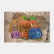 Fall leopard print pumpkins in blue, purple, orange and rose pink set on textured Autumn brown plaid background.