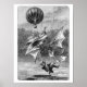 A terrified man is falling through the sky, desperately clinging to a tangled winged apparatus as the hot-air balloon from which his flying attempt was launched can be seen hovering above. Vincent de Groof was a Belgian shoemaker who styled himself the “Flying Man.” On July 9, 1874, he had his ornithopter launched from a balloon in an attempt to fly across the London sky. He met his death in Robert street (now part of Sydney street). The caption reads in the original French: Chute de l’homme volant, à Londres.
