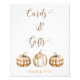 Pumpkin themed baby shower table top sign in natural tones featuring three pumpkins, two being in a plaid pattern and one with a floral arrangement. This cards and gifts little pumpkin baby shower sign is ideal for an autumn or fall baby shower.