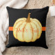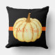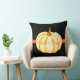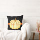 This cotton throw pillow is shown in a autumn fall pumpkin print with a black background color.