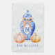 This chic design features chinoiserie ginger jar with a blue monogram and an orange bow surrounded by pumpkins. You can personalize with your monogram initial and your name.
