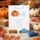 1st birthday pumpkin invitation with blue truck and blue plaid design, easy to edit text.