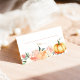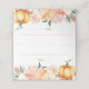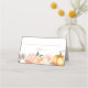 Fall-themed place cards or food tent cards. The design features orange pumpkin, flowers, and eucalyptus greenery.