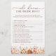 This item is a captivating blend of autumnal warmth and bohemian elegance that promises to make your celebration unforgettable. The centerpiece of this piece is a beautifully crafted pumpkin, delicately painted in soft tones, symbolizing the abundance and joy of the fall season. Surrounding the pumpkin, you'll find a stunning array of watercolor flowers and foliage in rich shades of terracotta, orange, evoking the vibrant colors of autumn. This item beautifully captures the spirit of a fall bridal shower, blending rustic charm with bohemian elegance to create a design that is both timeless and enchanting. With its stunning combination of watercolor artistry and boho-chic elements, this item promises a celebration that is as unique and special as the bride herself. Click on the “Customize it” button for further personalization of this template. You will be able to modify the style, colors, and sizes. Matching items available.