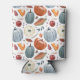This design features a beautiful autumn-themed pattern with a focus on pumpkins and other fall harvest elements. The design includes various pumpkins in shades of orange, cream, and muted blue, each detailed with subtle watercolor textures. Complementing the pumpkins are elements like corn on the cob, autumn leaves in warm earthy tones, berries, and slices of pumpkin pie. The pattern is set against a crisp white background, allowing the rich colors and detailed illustrations to stand out. This design captures the essence of the fall season, evoking feelings of warmth, harvest, and festive celebration.