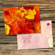 Red leaves postcard for Thanksgiving greetings. Yellow script across the front has a red shadow. Yellow, orange and red maple leaves cover the card. On the back, include a message, or remove the sample wording to order blank.