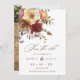 A beautifully elegant fall wedding save the date announcement with "save the date" in burgundy script font and decorated with a colorful watercolor floral arrangement of rust, burgundy, orange and peach flowers with green leaves. Personalize with your details in burgundy font and your favorite photo on the reverse.