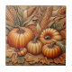 This ceramic tile showcases autumnal harvest imagery, including pumpkins and corn, rendered in rich, dark tones. It is suitable for both crafting projects and home décor applications.