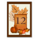 Bring the outdoors inside with this Fall themed wedding reception table number card done in rich brown and cream. Graphics of Fall colored leaves in rust, orange, and brown, and a pumpkin decorate a golden rust colored text area, in the middle. Personalize the dark reddish brown number, for each table at your reception.
