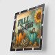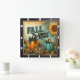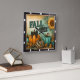 This square wall clock captures vibrant "FALL VIBES" with a distressed teal and orange text, set against a cheerful backdrop. It features an orange pumpkin with a buffalo check bow, a teal pumpkin, and a unique leopard-print pumpkin, all nestled amongst golden leaves and a bright sunflower, exuding cozy autumn charm.