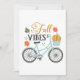 The "Fall Vibes" design is a charming and whimsical illustration that perfectly captures the essence of autumn. The central element of the design is a vintage-style bicycle rendered in a soft, pastel blue color. The bicycle has a classic, retro look with curved handlebars and a basket attached to the front.