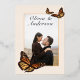 Elegant Gold foil invitation lettering on elegant ivory background is complemented by colorful autumn dahlias, roses, anemone, wheat stalks and monarch butterflies to make a striking but simple wedding invitation. The Monarch butterfly emphasizes the gold foil text on the front and the couple photo on the back for a truly autumnal wedding theme.