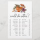 Dive into a dreamy autumnal escape with our enchanting Fall Would She Rather Game. From hand-painted watercolor pumpkins and blossoming burgundy and terracotta fall flowers to rustic forest green and rust botanicals — every detail is thoughtfully painted. Add a personal touch with burnt orange or burgundy calligraphy on invitations, napkins, and favor tags. Complement the scenery with themed party games, baked goods, and much more! Celebrate love in the most magical way.