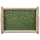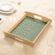 This pretty serving tray features a pattern of subtle geometric diamond shapes in lighter green on a darker green background. The top half of the tray has tiny gold shamrocks falling down from the very top. Cute, and an attractive, unique way to show your Irish side.